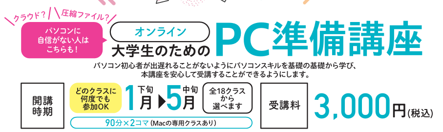 大学生に必要なパソコンスキルを学ぶ「大学生のためのPC活用講座」とのセット申込(29,800円)を強くおすすめします。
