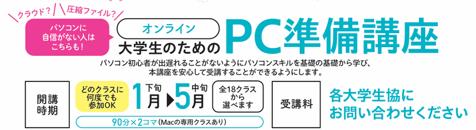 大学生に必要なパソコンスキルを学ぶ「大学生のためのPC活用講座」とのセット申込を強くおすすめします。