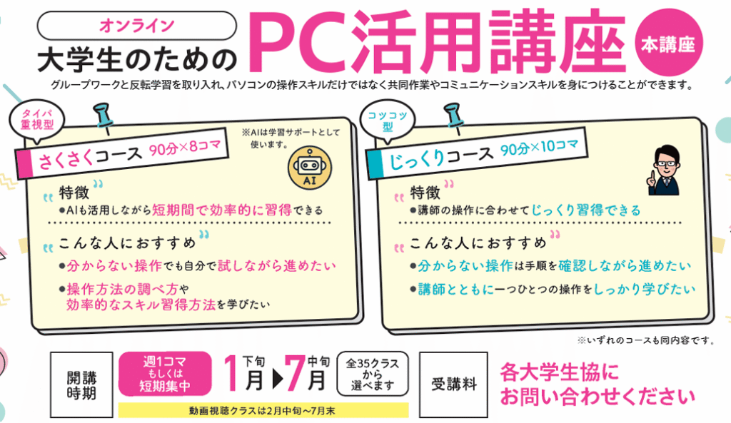 ※上記受講料は、ご入学予定の各大学生協の定める方法及び期限によりお支払い下さい。 - 本講座は 2026年1 月~2025 年 7 月までの期間で開講し、クラスを選択して受講いただきます。